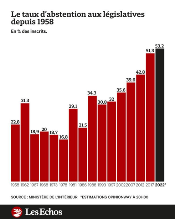 Logiquement l’inversion du calendrier électoral ainsi que le relatif bon résultat d’Emmanuel Macron lors du 1er tour de la présidentielle (8,6 millions en 2017 et 9,8 en 2022) auraient du être favorable à Ensemble. Mais voilà, en politique, rien n’est jamais acquis surtout en ces périodes troubles. D’ailleurs un sondage récent à montré qu’environ 55% des électeurs (toute tendance confondue) souhaitaient forcer le président à cohabiter grâce à ces élections dont 85% pour les pro nupes et 72% pour ceux d’extrême droite. (Le paysage politique aurait eu une autre opposition j’aurais compris mais là franchement ….)